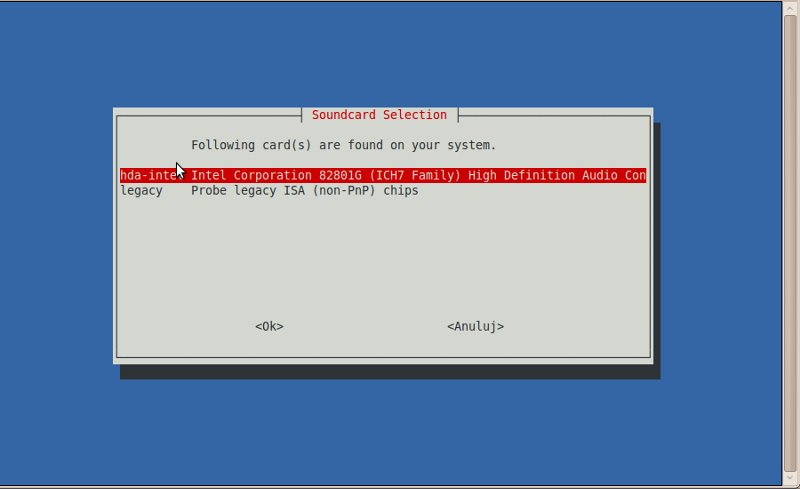 Zainstalowałem czystego Debiana (system podstawowy) bez środowiska graficznego. Przeszedłem do instalacji dźwięku - alsa, posługując się wskazówkami z tego tematu http://forum.ubuntu.pl/showthread.php?t=65146 , ponieważ: