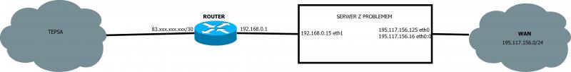 Posiadam w serwerze dwie karty sieciowe. Jedna z nich ma przypisane dwa interfejsy eth0 oraz eth0:0, które pracują w podsieci 195.117.156.0, obsługują komputery w sieci WAN. Druga karta ma przypisane oznaczenie eth1 w adresacji 192.168.0.1 (wpięty w DSL), służy on do łączenia się tylko z serwera do internetu m.in. w celu pobierania sygnatur av. Komputery z interfejsów eth0 i eth0:0 nie mają dostępu do internetu. Problem polega na tym, iż nie mogę na stałe zestawić połączenia na eth1. Interfejsy eth0 działają nieprzerwanie i poprawnie, natomiast gdy chcę pobrać nowe sygnatury muszę wykonać: