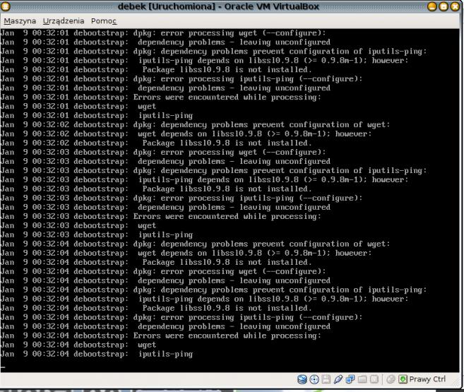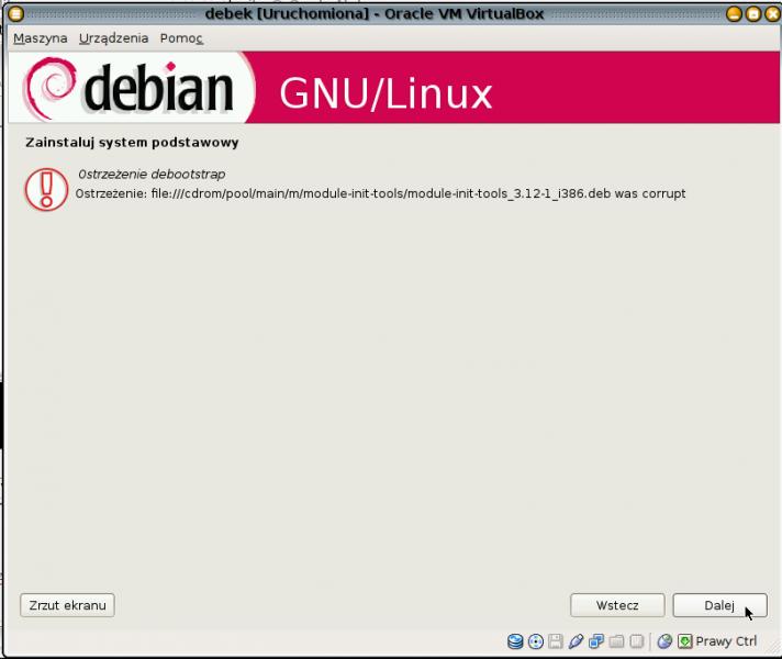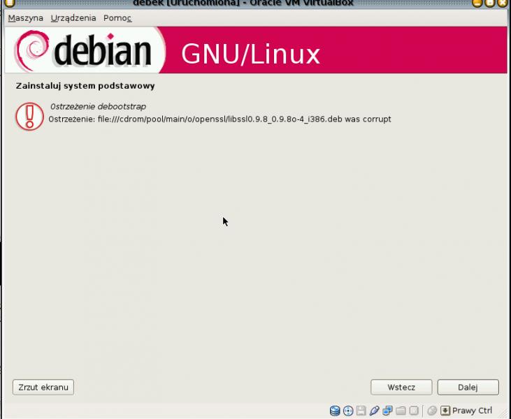 Dodam jeszcze, że instalowałam "na próbę" na virtualboksie, który jest na już zainstalowanym Debianie Lenny. Maszyna wirtualna była odcięta od sieci (znaczy jest tylko w sieci z gospodarzem, miałam na myśli sieć globalną), bo jak będę instalować na głównym komputerze, to też będę odcięta od sieci.