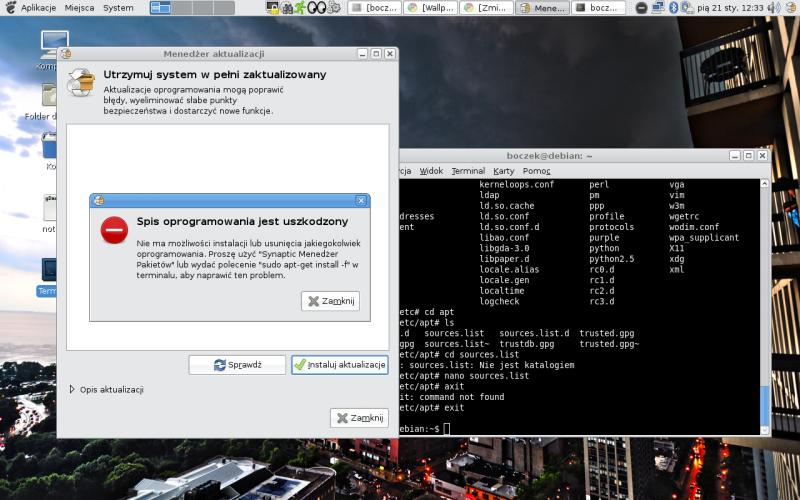 Podczas próby automatycznej aktualizacji wyświetla się pokazany na obrazku komunikat. Proszę o pomoc. Próbowałem za pomocą Synaptica, ale taka sama sytuacja.