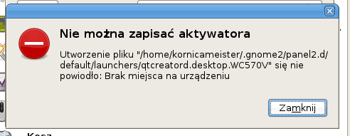 Dzisiaj jednak pojawił się nowy problem. Mianowicie, chcąc mieć dostęp do przeglądarki Chrome z paska, spróbowałem dodać skrót na panel, ale dostałem błąd, że nie mam wystarczająco dużo miejsca na partycji /home. Potem spróbowałem zmienić konfigurację monitora, tym razem zapisałem jak wygląda komunikat błędu, załączam zrzut ekranu