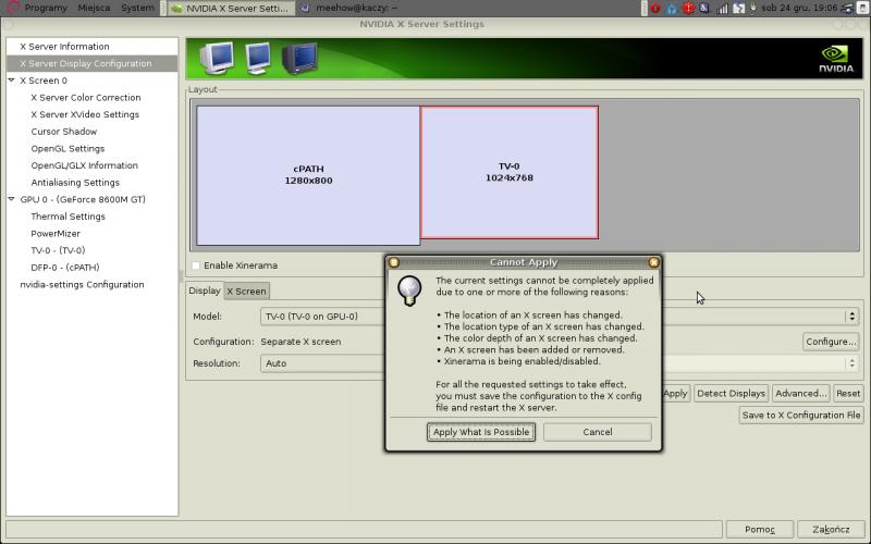 jako, że są Święta i trochę wolnego to chciałbym sobie obejrzeć kilka filmów na TV. Ale niestety nie potrafię skonfigurować Linuxa. Posiadam kartę GeForce 8600GT. Próbowałem ustawić to po prostu w NVIDIA X Server Settings. Ale po naciśnięciu Apply wyskakuje komunikat o kilku powodach przez które nie można ustawień zaakceptować. Poniżej zrzut ekranu: Czyli muszę dokonać zmian w xorg.conf ale nie wiem jakich. A nie chce sam tam coś mieszać. Dlatego proszę o jakieś sugestie i pomysły.