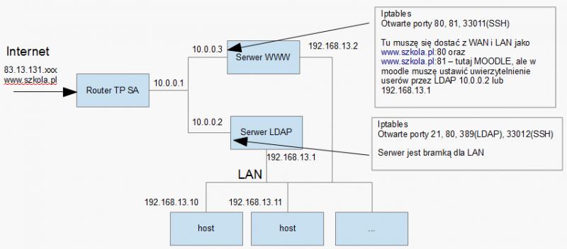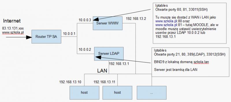 Na serwerze WWW jest strona szkoły, na domenie http://www.szkola.pl i platforma elearningowa MOODLE na porcie 81.