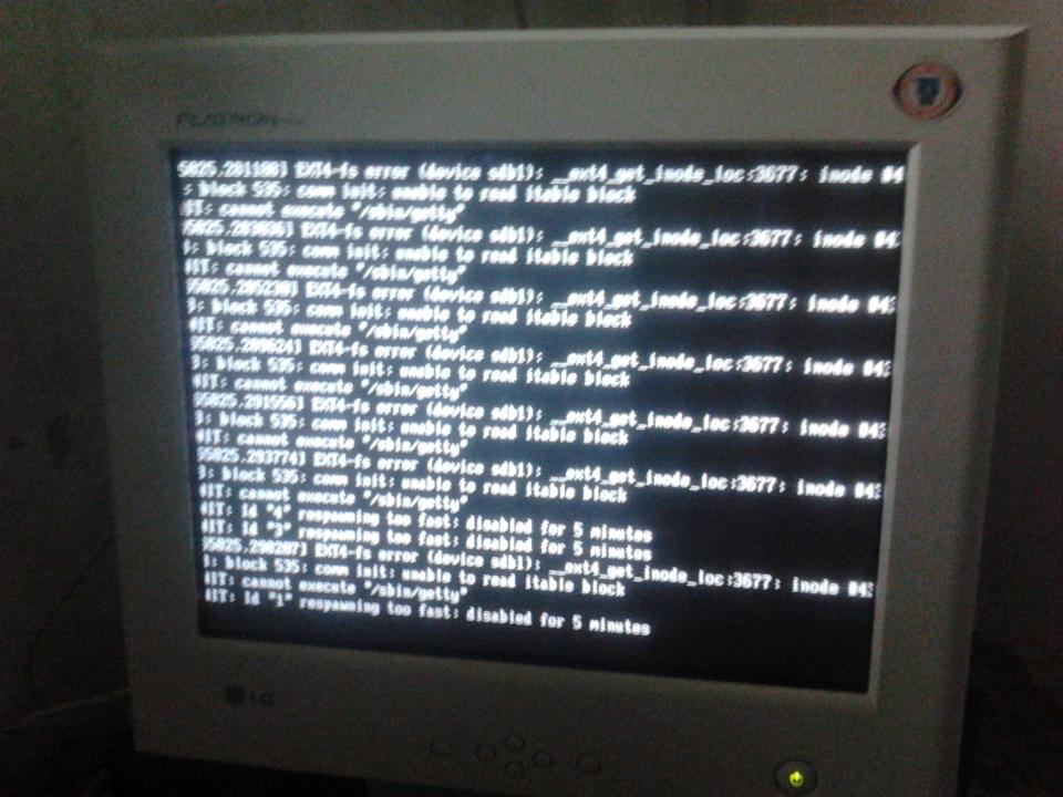 Z racji tego, że komputer zawieszał się coraz częściej oraz popsułem konfigurację Apache, postanowiłem przeinstalować Debiana. Instalacja na tym samym pendrivie nie powodziła się (instalator wyrzucał błędy coś związane z niemożnością zapisania układu partycji). Wybrałem to tego celu innego pendriva (kiedyś zainstalowany był na nim XBMC /w wersji opartej o Ubuntu/). Standardowo partycja "SWAP" (być może to go uszkodziło) i partycja główna "/". Tu jednak system nie podziałał zbyt długo - całe 3 dni. Przy próbie startu wyskakują takie komunikaty.
