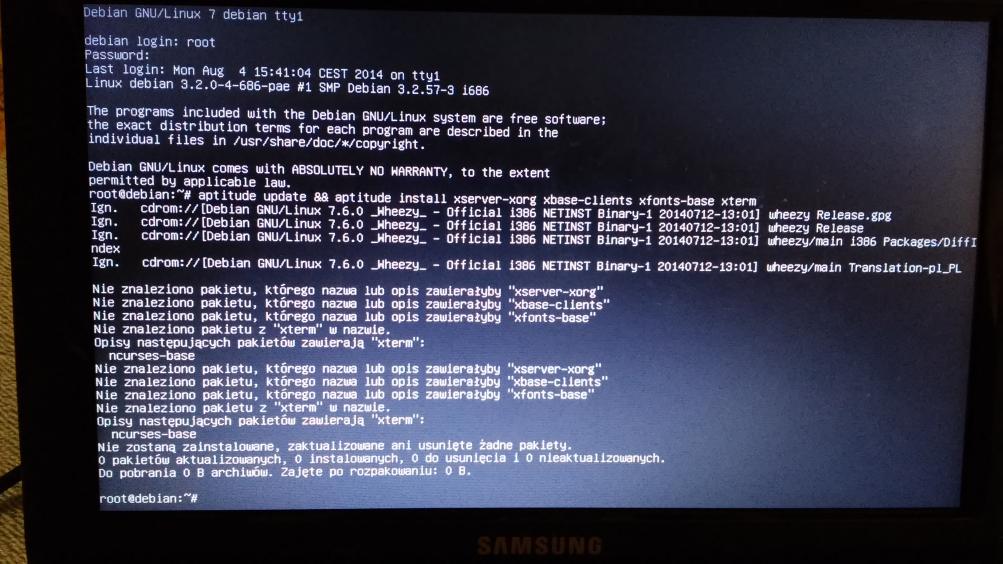 Hej. Po zainstalowaniu debiana wheezy z obrazu netinst mam tylko tryb tekstowy bo nie mialem sterownikow do karty sieciowej. Po znalezieniu i zainstalowaniu sterowników. Chciałem zassać X'y i GNOME'a. Ale jest problem bo jak wpisuje w terminal