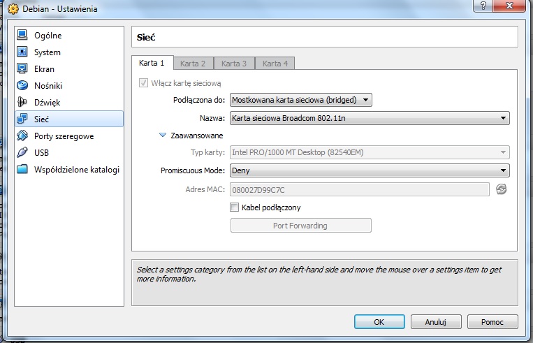 Jak zmieniam na mostek to debian nie nawiązuje połączenia sieciowego w ogóle (nawet po restarcie), a ustawienie wygląda tak: