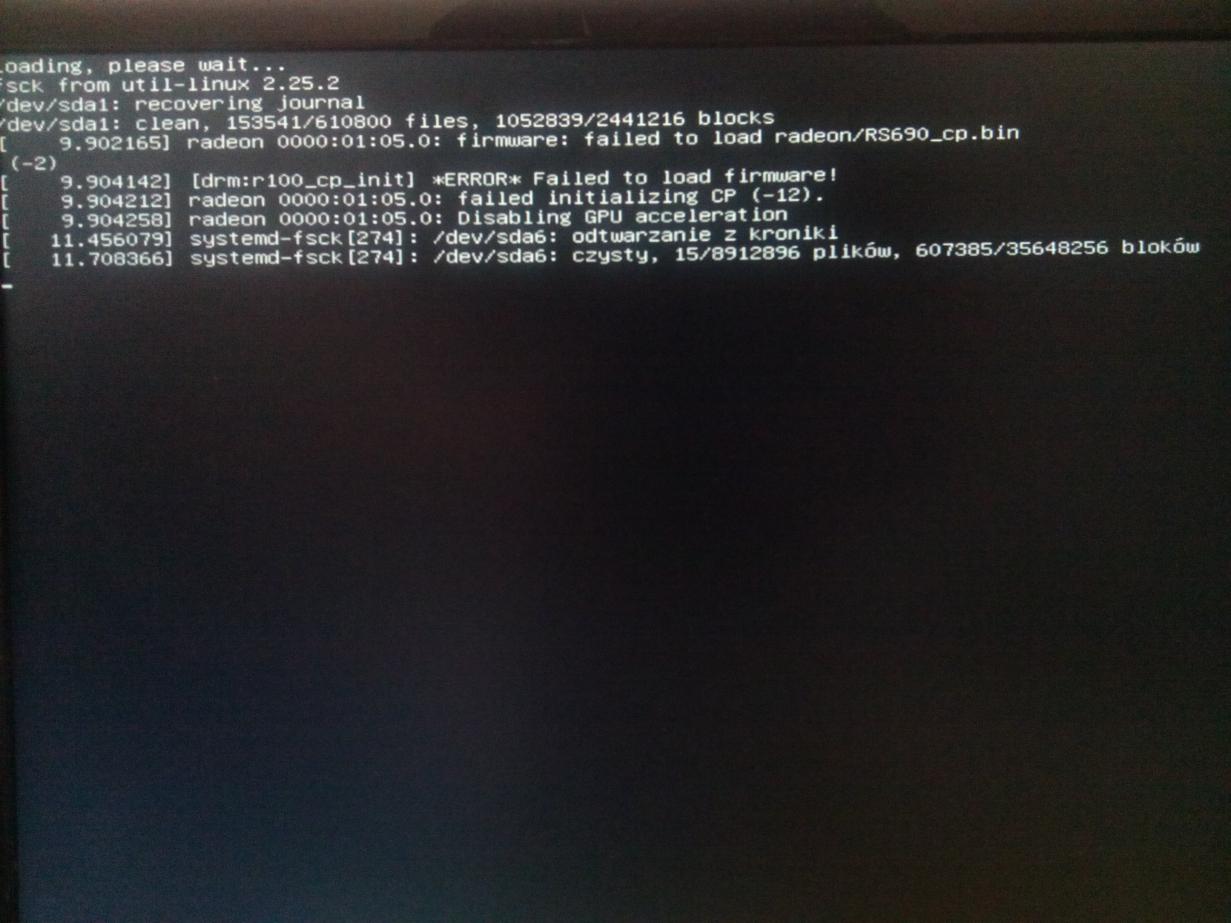 Z ostatnich napisów przed szarym tłem (zdjęcie w załączniku) wnioskuję, że brakuje sterownika grafiki rs690_cp.bin