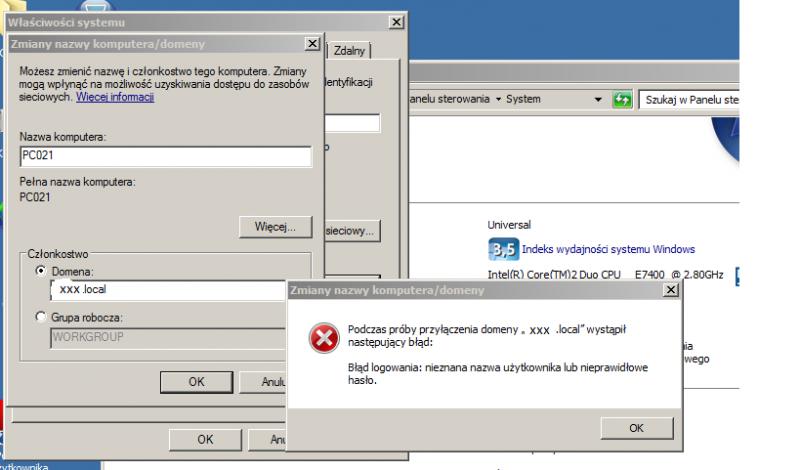 Mam problem z dodawaniem komputerów do domeny SAMBA 4. Dodałem dwa kompy z win7 i koniec. Przy każdym następnym dochodzę do momentu gdy wpisuję login administrator i hasło i koniec. Pokazuje mi się komunikat: "błąd podczas próby przyłączenia do domeny xxxxx.local. Błąd logowania, nieznana nazwa użytkownika lub nieprawidłowe hasło. Co może być powodem. Problem dotyczy WIN XP i WIN7(oczywiście pro). Załączam zrzut: