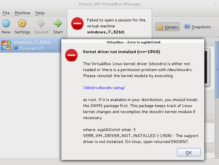Witam! Zainstalowałem VirtualBox 4.1.42 z menagera pakietów ale wyskoczył mi jakiś błąd. Spróbowałem wiec paczkę .deb nowszą wersję to jest 5.0.5 ale znowu mam ten sam błąd przy próbie odpalenia maszyny wirtualnej tak jak na poniższym obrazku. Pisze że jest problem z jakimś sterownikiem i żebym go przeinstalował, ale jak to zrobić: