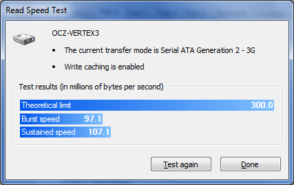 Timing buffered disk reads: 344 MB in  3.01 seconds = 114.40 MB/sec