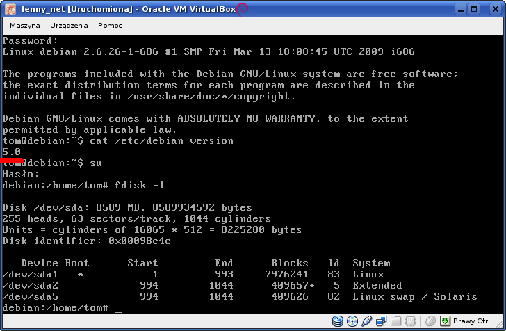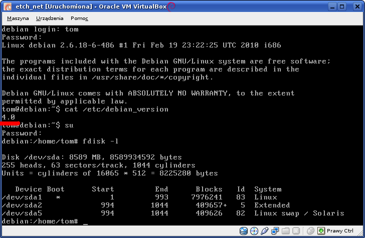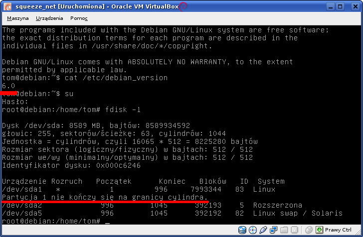 instalacja Squeeze i wynik fdisk: Partycja 1 nie ko