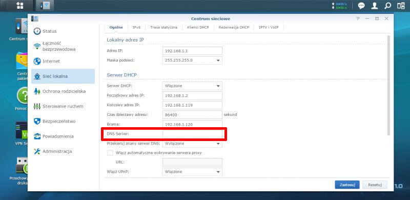 Na routerze konfigurujesz DHCP tak, aby rozdawał adresy IP, jak do tej pory, ale jako bramę podawał 192.168.1.120. Możesz skonfigurować serwer DHCP na komputerze (po co, skoro już jeden masz), ale wtedy wyłącz go na routerze. Adresy DNS-ów mogą wskazywać na router lub jakiekolwiek DNS-y na świecie.