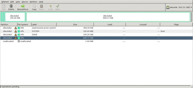 Problem w tym, że GParted widzi podział dysku błędnie. Tak mi się wydaje. Spójrzcie na dysk o etykiecie "DANE' wg Windowsa: powinna mieć 780GB, a wg GParted ma tylko ponad 100GB. Dlatego nie wiem co to jest za twór ta partycja sda4 i co faktycznie oznacza. Partycja o etykiecie "SYSTEM" powinna mieć 105GB a ma wg GParted 100MB. Dlatego nie chce usuwać partycji sda4 bo nie wiem co tak naprawdę usunę.