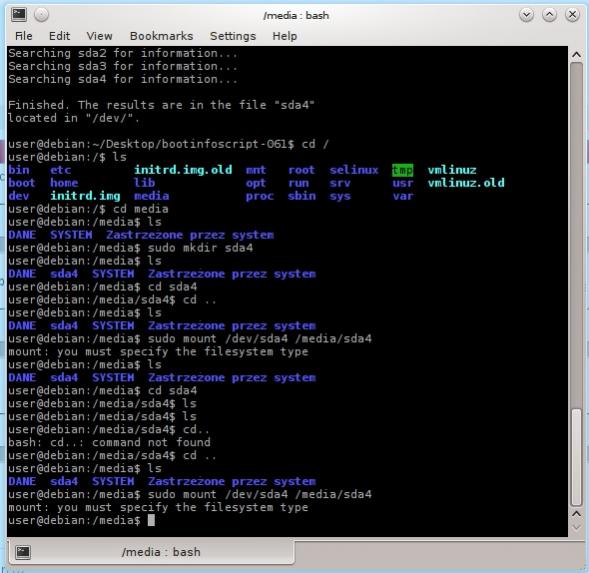 Podaj wynik skryptu bootinfosrcipt:http://sourceforge.net/projects/bootinfoscript/ .Co siedzi na /dev/sda4? Zamontuj ją - jako root: